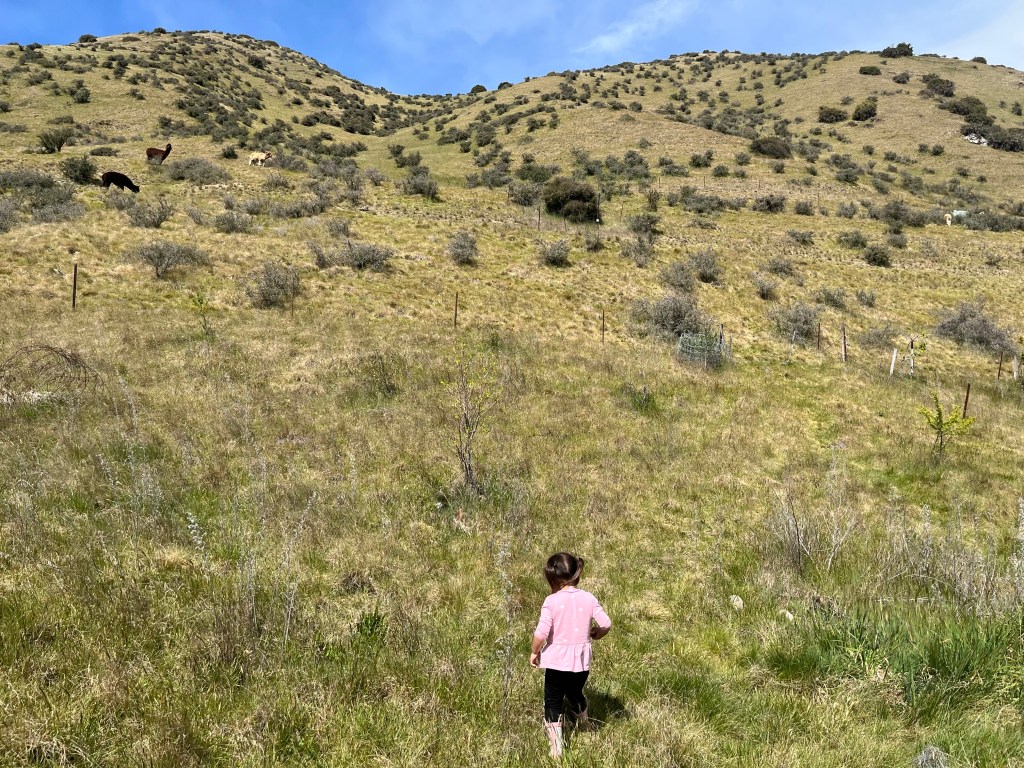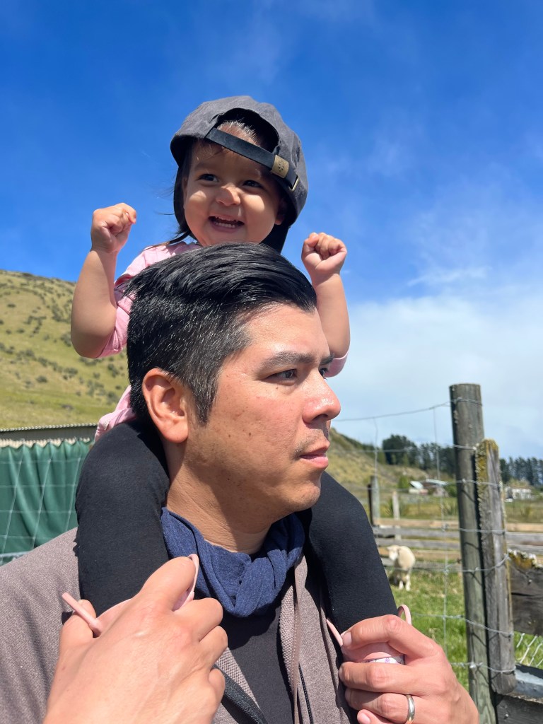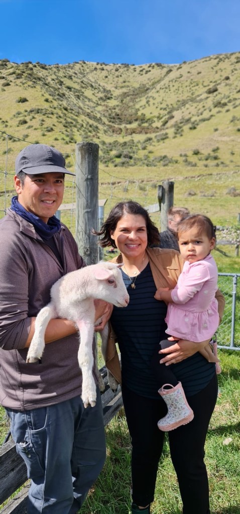 The next week we participated in our first ever sheep day – perhaps the most New Zealand thing possible. We went to Wylie’s colleague’s farm for their annual lamb tagging and docking followed by a bring and share (aka potluck). I was worried about what docking lambs meant, I heard it was tail removal… but it’s literally just putting a rubber band on their tails near the base and eventually the tail will fall off. The tails can be a big source of infection, so they are docked to keep them healthy. The group got to help herd the sheep and snuggle up with some very cute lambs. They also had alpacas on the farm and Mara really loved seeing them, she wanted hugs, but the alpacas were not into it.