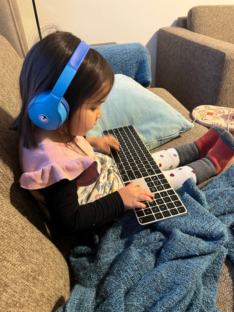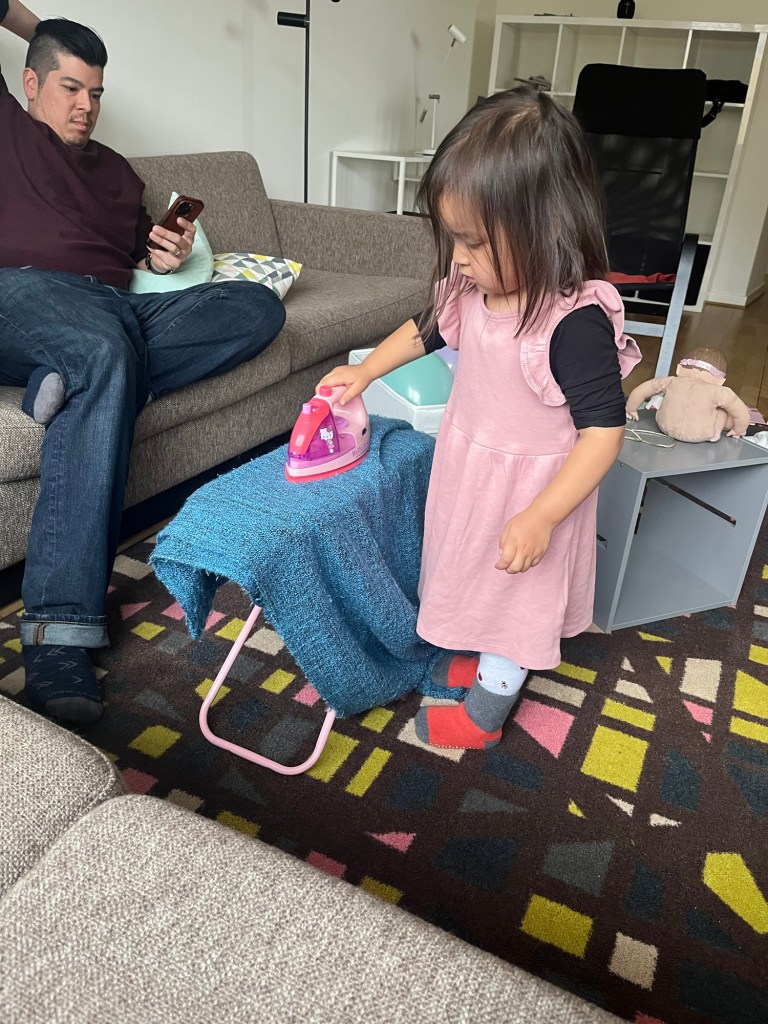 Mara has really taken a liking to dresses, which is a real 180 from before. I think she likes wearing the tights underneath mostly. We’ll see if this evolves as the weather gets warmer and tights aren’t needed anymore. Some of her favorite play activities at home are remarkably similar to our normal activities… “working” on my keyboard with her headphones that are not connected to anything, doing laundry and ironing (ok we never iron but Mara loves this little set we found at a second hand shop), and putting her baby to bed with a story.
