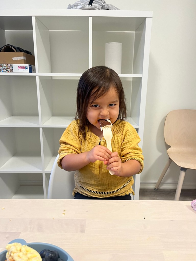Mara’s food preferences (pickiness) has not improved much unfortunately, but there have been a few small additions to the foods she’ll eat. All food is provided by daycare which is amazing…except the only thing Mara will eat is fruit. We’ve been trying everything we can think of to get her to eat real food, but this kid is so stubborn it’s just not happening. Staples now include fruit, rice cakes (new woo!) with peanut butter and Nutella, drinkable yogurt, and her beloved canned tomato soup with dried ramen sprinkled in. The other day Mara spotted dozos (rice crackers we discovered in Thailand) in the Asian store and that was so exciting for everyone, she happily hopped in her stroller so she could eats dozos on the go. And she just became interested in ice cream, she didn’t like that it was cold and creamy before 🙂 I was pretty proud of my technique to cut a mini magnum bar in half and stick it on a takeout fork. Mara ate the chocolate and some of the vanilla ice cream until it started tasting “too creamy” then she was done.