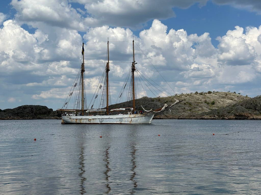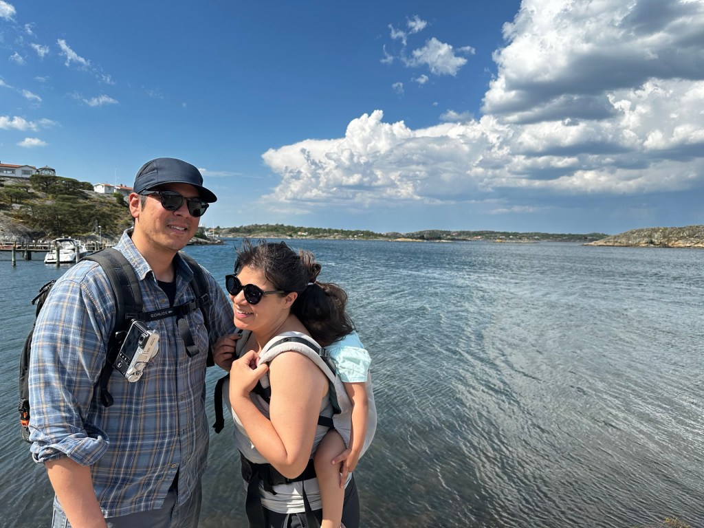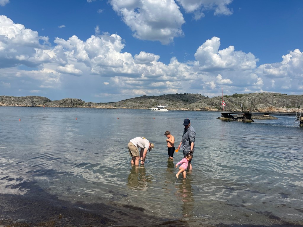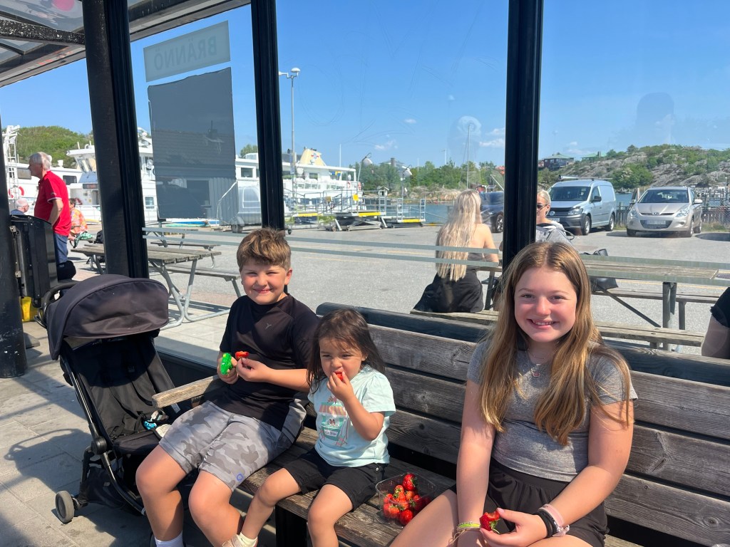 The next day was our family adventure day to the archipelago. We decided to go back to Styrsö since it was so accessible and easy. We took the tram to the ferry, with a quick stop for strawberries while we waited for the ferry. We had lunch at the other of the two restaurants on the island (so now we’ve experienced all of the cuisine on the island) and the kids played at the amazing playground while we waited for food. After lunch we were torn between walking around the island or just going straight to a swim spot, but the forecast was showing rain coming so we opted for the beach first. We found another small sandy beach and the kids wasted no time getting into the water and playing on the sand with borrowed and improvised beach toys.