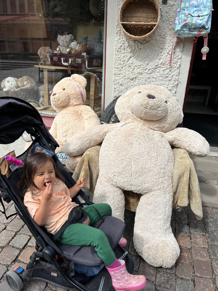 We had a few hours after the museum before they had to leave for the airport so we made the most of time by splitting up. Wylie had to go to some meetings at work, Jay and Finn went back to Slottskogen to ride the giant slide (since Jay didn’t get to see it on day 1) and Mara and I went with Sarah and Maggie to Haga for some shopping. Mara enjoyed her strollie snacks while they went inside the tiny shops.