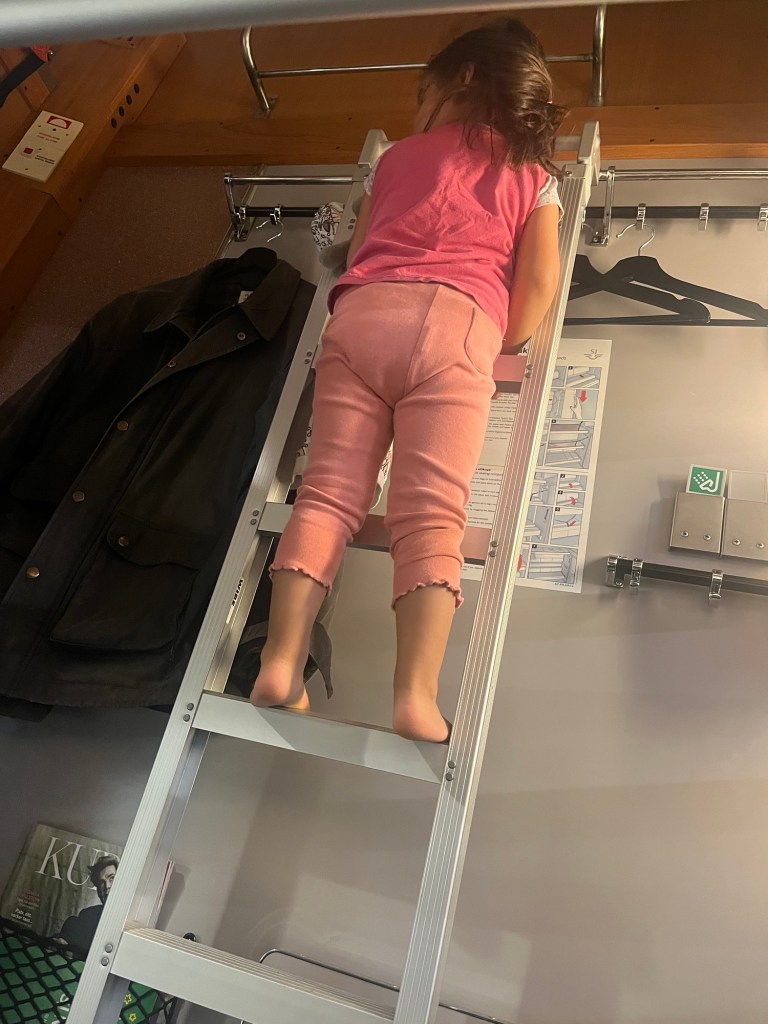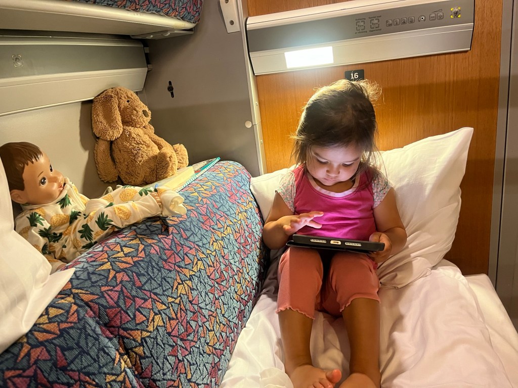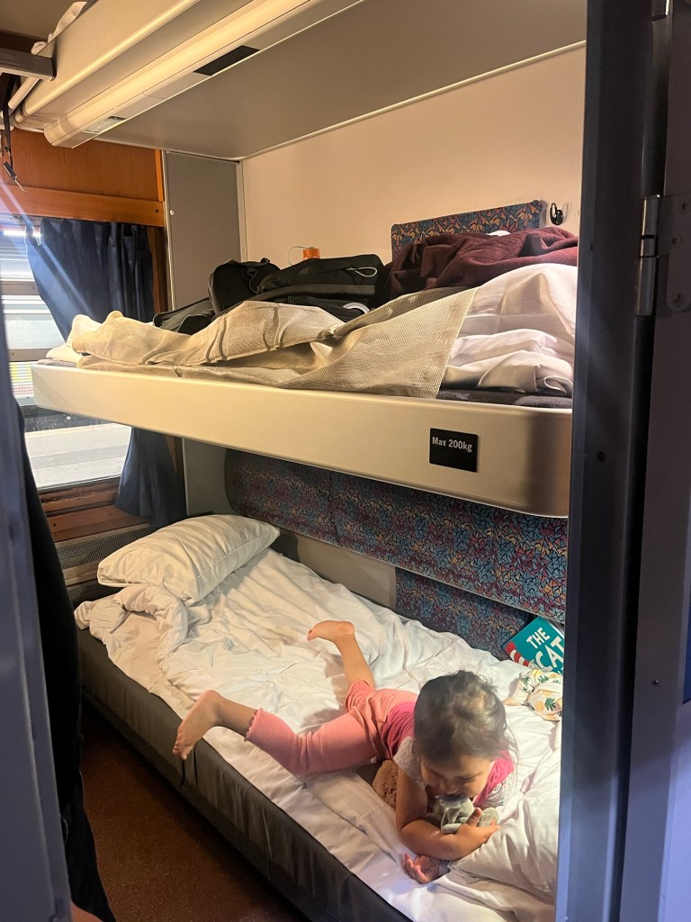 We first took the high speed train to Stockholm then transferred to the 10 hour night train to Umeå. The night train was quite the experience! We booked a sleeping car for 3 which was perfect for us. We had 3 beds, but Mara and I shared, a bit of storage and a tiny sink. Bathrooms were down the hall and showers were even available but we didn’t use them. The beds were actually surprisingly comfortable! Mara was so excited, she absolutely loved the novelty of sleeping in a bed on a train. We brought her normal bedtime books and did as normal of a bedtime routine as possible and surprisingly she slept all night, well from about midnight to 7am, which was a huge win! I on the other hand did not sleep much, the clanging sounds under the train were just so loud, even with earplugs and a white noise machine blasting it was impossible for me to tune out. I finally dozed off around 3am during a 45 minute stop where the train split off into 2 and goes different directions. Wylie also slept a bit on and off, neither of us were super rested but at least Mara slept!