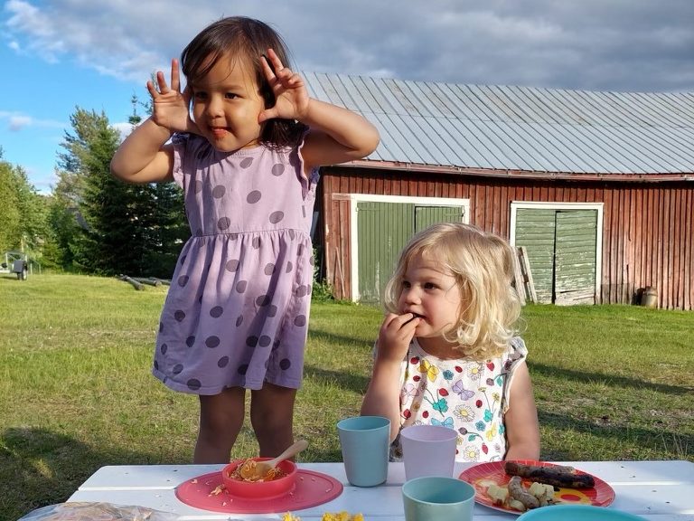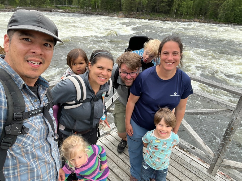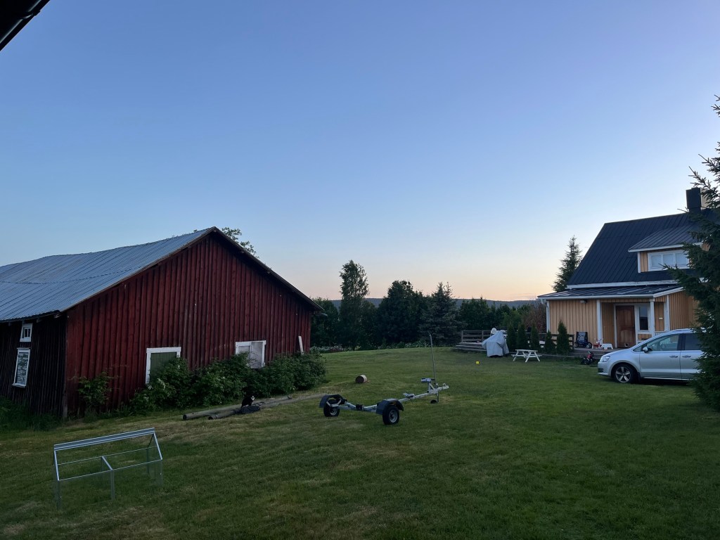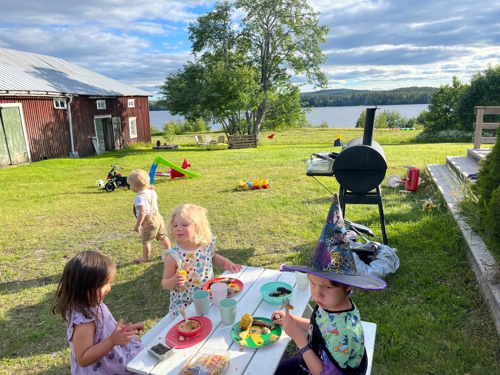 The rest of the family came home after our rest and everyone got to meet each other. Hudson, Marta’s husband, is originally from Texas and has been in Sweden for over 10 years, first in Gothenburg where he and Marta met, then the two of them moved up to Umeå for Marta’s job at the university. Then there’s Raphael, who is almost 5, Charlotte, who is 3, and Benjamin who is a year and half. So with 4 kids under 5 for the long weekend, we were in for a wild ride! Marta is from Switzerland and speaks to the kids in French which was awesome for us to be able to hear! And it gave us confidence because we understood about 90% of French for kids so that’s a good start. We had a delicious raclette dinner then headed in for the night… which never got dark! The picture below was at midnight.