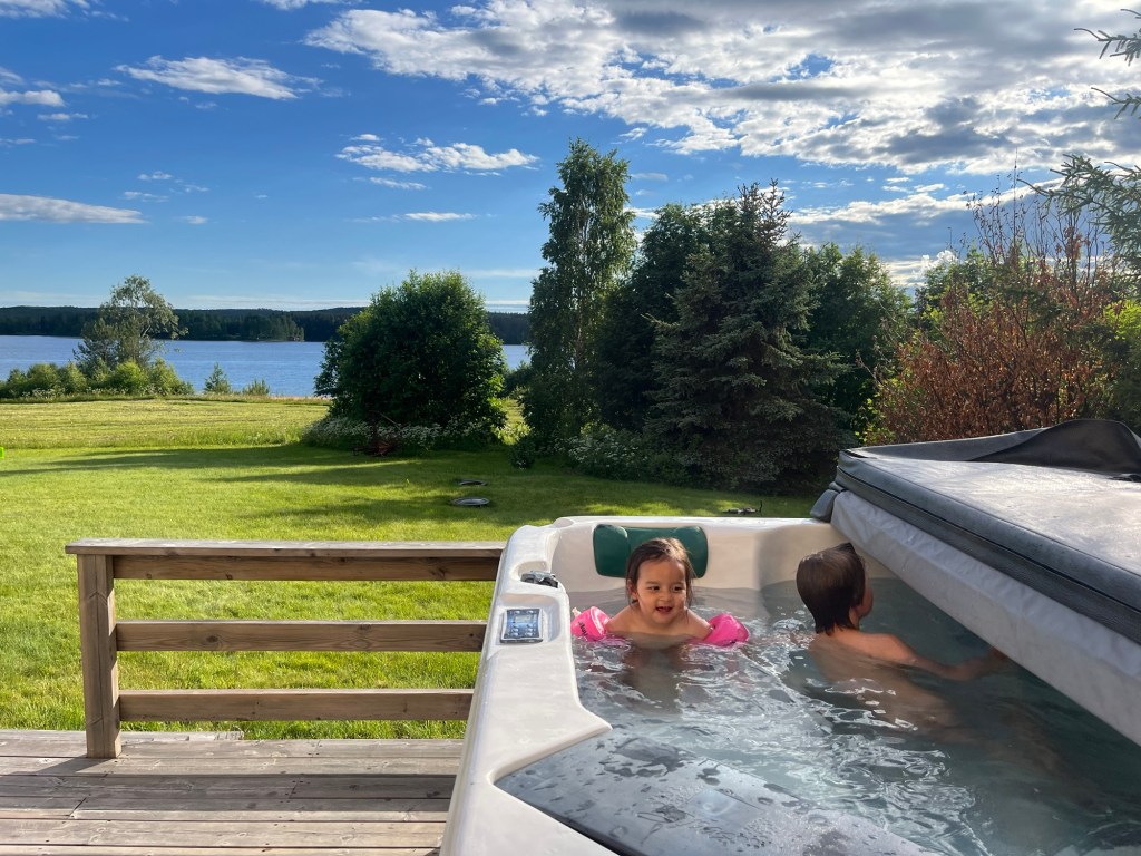 We hung out at the house for the afternoon, Charlotte and Benjamin went to bed early and Mara and Raphael stayed up for a dip of their own in the jacuzzi. Mara was truly living her best life. She was so excited to play in the “hot pool.” After all that activity she went to sleep quickly and the adults had dinner around the fire-pit. Hudson made reindeer stew, his version of a traditional Sami dish of reindeer meat called Suovas. On its own the meat was a bit intense for me but together with the mashed potatoes and homemade lingonberry jam it was quite good. We also sampled a number of Hudson’s home brewed beers – lavender, pine, and my favorite – dandelion. They are real homesteaders, making so many delicious things with what grows on their land.