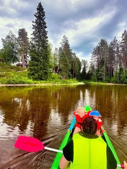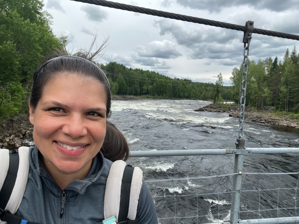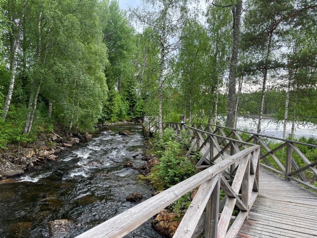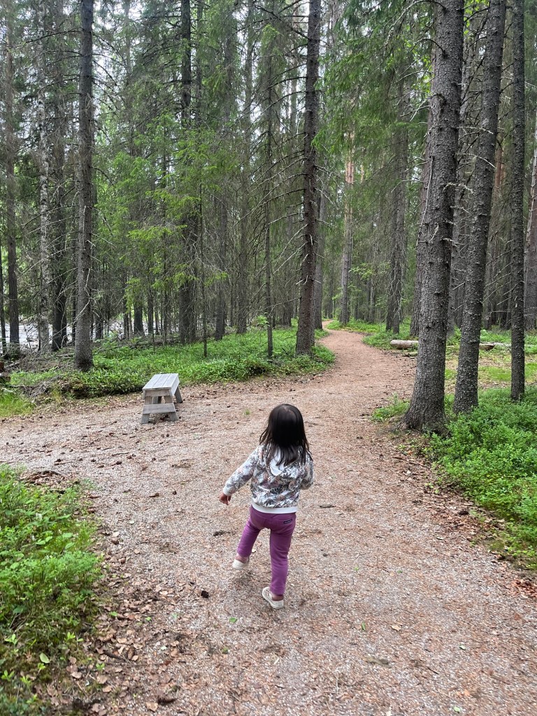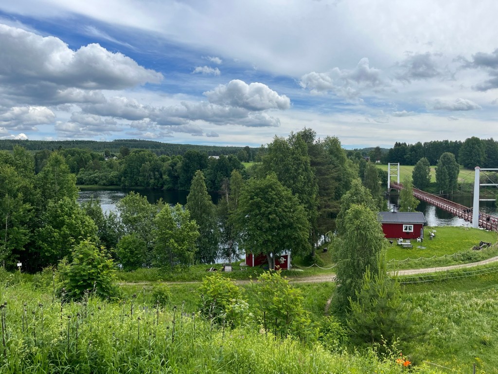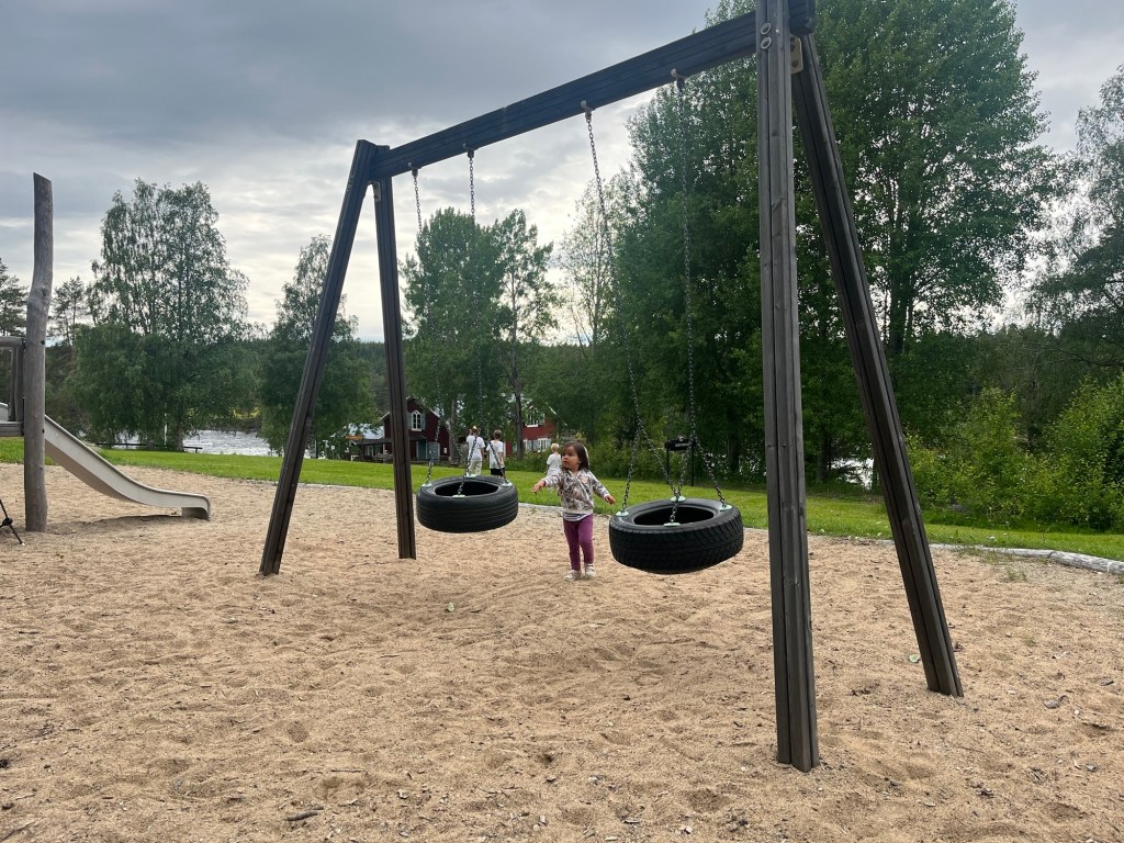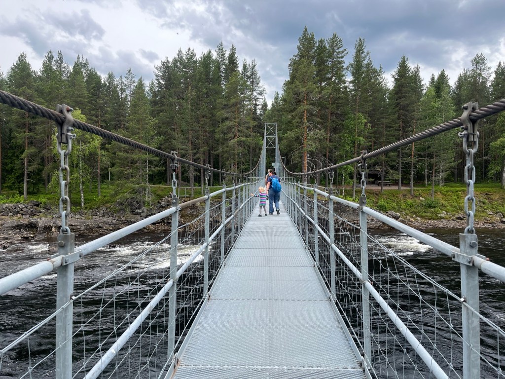 After our morning ice cream we stopped at a grocery store to gather supplies for a hike. Mara quickly fell asleep in the carrier as she does, and we had a nice walk along the Vindelälven river and over swing bridges. We stopped at an open grill that was fully equipped with wood and Hudson grilled up sausages we bought for lunch. Mara woke up mid way through lunch and we all slowly ventured back, with a stop at a playground before getting back in the cars and heading home.